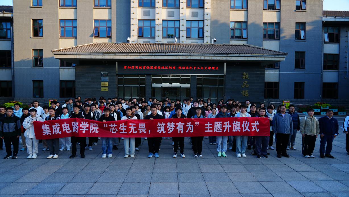 10月13日清晨,集成电路学院在校园国旗广场举行“芯生无畏,筑梦有为”主题升旗仪式。学院院长闫江、全体教师及本研学生代表参加活动,在庄严氛围中凝聚“强芯”共识。国旗护卫队队员迈着铿锵步伐护送五星红旗入场,雄壮的《义勇军进行曲》奏响,国旗冉冉升起。全体师生肃立注目,高唱国歌,爱国情怀与“强芯”使命在晨光中激荡。院长闫江教授在国旗下作讲话。他以国庆阅兵中搭载自主研发芯片的装备方阵为引,强调“核心技术自...