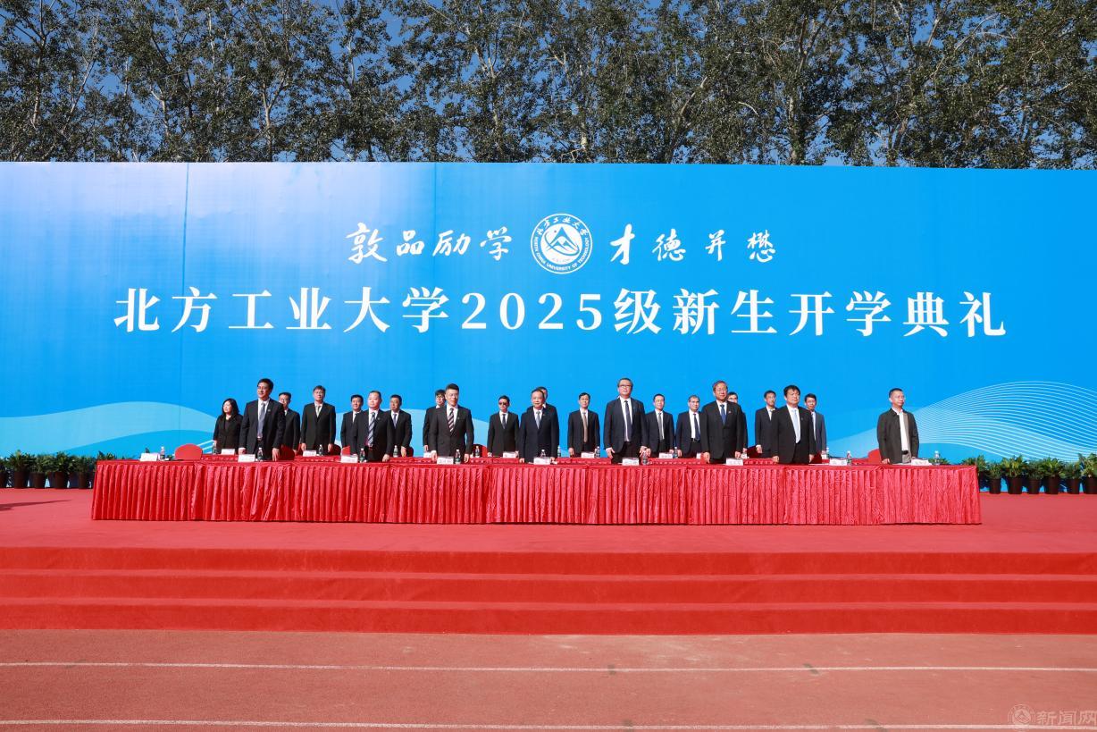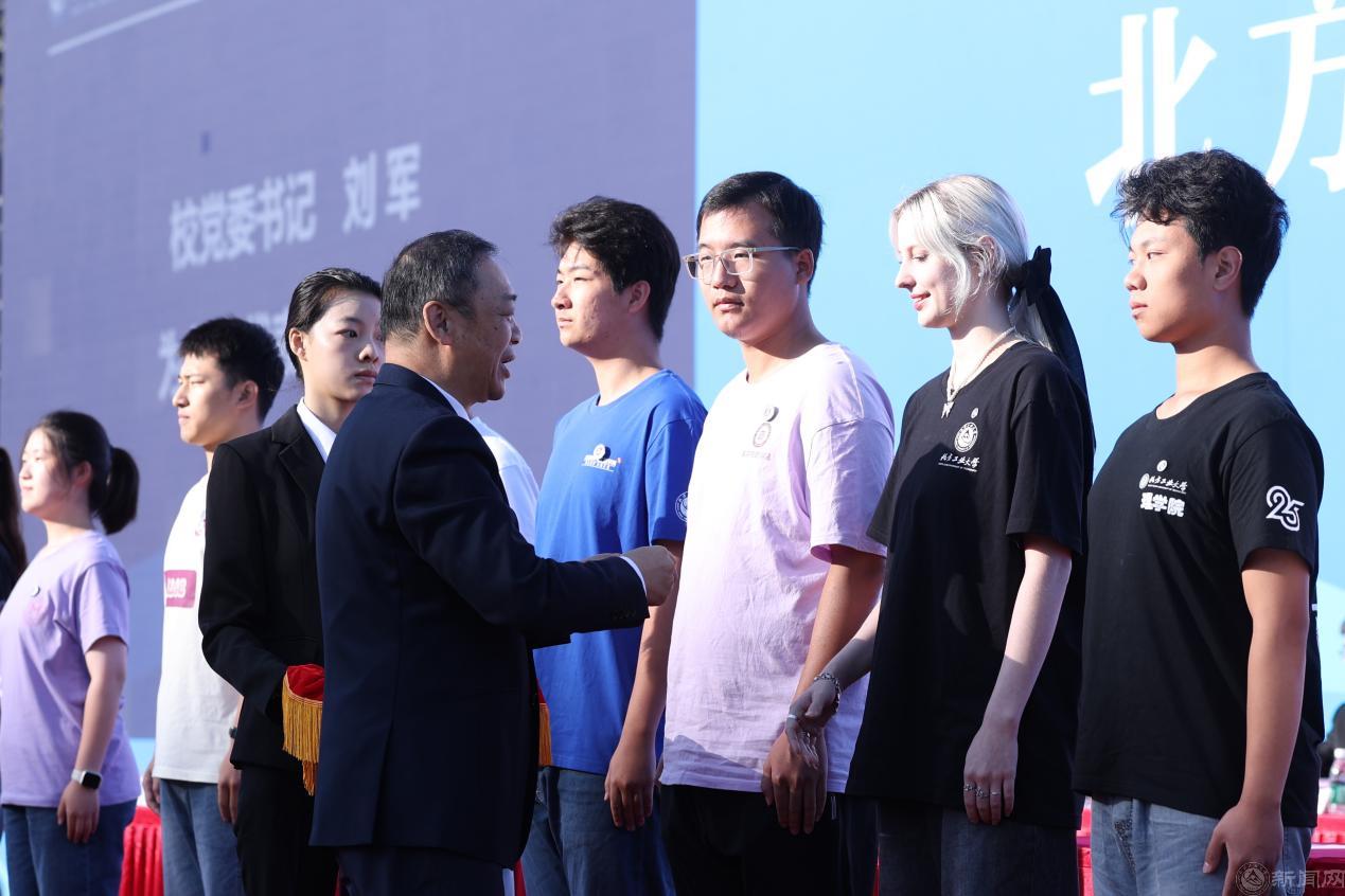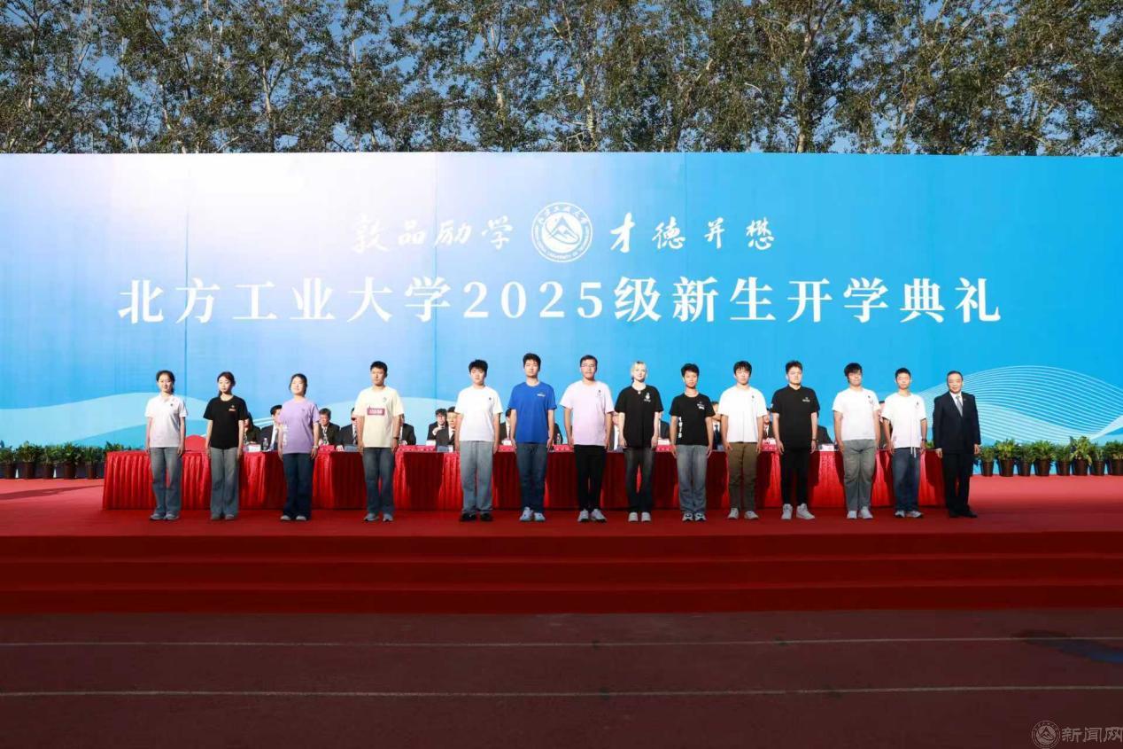 党委书记刘军为新生代表佩戴beat365亚洲体育在线官网校徽,欢迎2025级新同学加入北方工大,开启人生新征程。