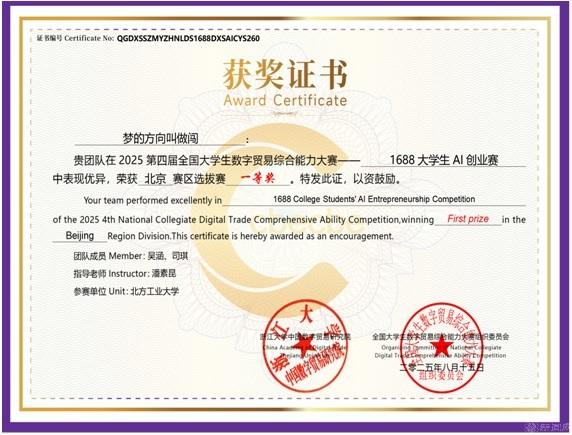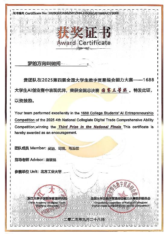 近日,由浙江大学中国数字贸易研究院主办、全国大学生数字贸易综合技能大赛组织委员会承办的第四届全国大学生数字贸易综合技能大赛总决赛在浙江大学圆满落幕。365官网学生吴涵、司琪、毛玉佳组成的代表队获得北京赛区一等奖、全国总决赛三等奖。