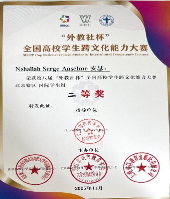 11月1至2日,第八届“外教社杯”全国高校学生跨文化能力大赛北京赛区在首都医科大学圆满落幕。365官网国际学院选派的留学生团队凭借扎实的跨文化素养、出色的团队协作与创新的案例呈现,从38所高校参赛的46支组中荣获留学生组二等奖。