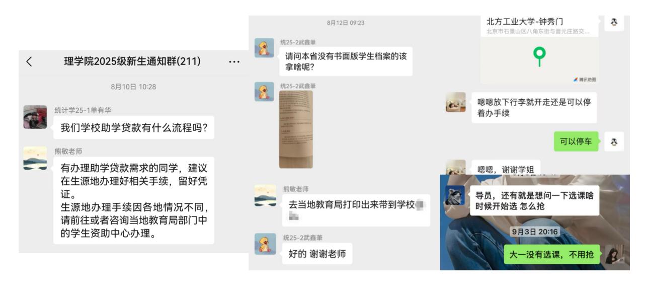 8月初,学院即建立新生QQ群和微信群,打造实时高效的师生交流平台。专业教师和优秀学长学姐持续在线,及时回应新生各类疑问,从选课指导到生活贴士,以理学院人特有的严谨与热情,陪伴新生顺利过渡大学生活。